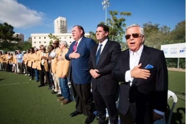 Nineteen professional football Hall of Fame stars arrived in Israel this week for a week-long event headlined "Touchdown in Israel: Mission of Excellence." The event was sponsored by Jewish billionaire and owner of current NFL champion New England Patriots Robert Kraft, who accompanied the former players to Israel. Kraft attended a festive ceremony launching the event on Sunday, held at the Kraft Stadium he built in Jerusalem. The ceremony was attended by a large crowd of players and fans. In 1994, Kraft purchased the football team he loved as a fan, despite its lackluster record. After the purchase, the Patriots saw a steady string of successes, turning into the team with the most titles in the league, including four Super Bowl victories. "It reminds me of the story of Moses," Kraft told Israel Hayom in an interview Sunday. "For 40 years, the team was in the desert, and the moment I bought it, it began winning titles." At the ceremony, Kraft sang the Israeli and the American national anthems, and had trouble concealing his excitement. "I am very emotional," he said. He added that his personal and business decisions, including the decision to purchase the financially failing team, were "made out of passion." Kraft expressed his joy at being in Jerusalem and his hope to see an Israeli player in the NFL. "I grew up in a traditional family," he said. "I put on tefilin when I was young. My first trip to Israel was in 1963, for my honeymoon, and I remember how angry I was when I looked out from the balcony at the King David Hotel and saw armed Jordanian soldiers keeping me from visiting the holy sites. "After the Six-Day War, we were all able to go and pray. I was in favor of building bridges between the peoples." Kraft declared that after the U.S., "Israel is my favorite place to be. Where else can you find the two holiest sites to the monotheistic faiths side by side-" Asked whether his team's most recent victory, achieved in the final seconds of the game, was the sweetest, Kraft said, "I think the first victory was the most exciting. But thank God we won the last game too, and with God's help we will win the next game." As for purchasing a team in Israel, Kraft was hesitant. He said he had been approached about purchasing a basketball team a few years back, but decided to focus on one thing at a time. "If you want to focus, it is best to focus on football and soccer, since I also own a soccer club," he said. The idea to bring the 19 Hall of Famers to Israel came from Israeli Ambassador to the U.S. Ron Dermer, himself a former player in the Israeli football league. "I was on a trip to Canton, Ohio, and I visited the Hall of Fame. I thought to myself that these people are like modern gladiators; people in American worship them. They have the same value as a year's worth of public diplomacy [for Israel]," he said. Only 295 former players have had the privilege of wearing the Hall of Fame gold jacket, and only 168 of them are still alive. Of those, 19 were in Jerusalem on Sunday, receiving the warmest Israeli welcome.