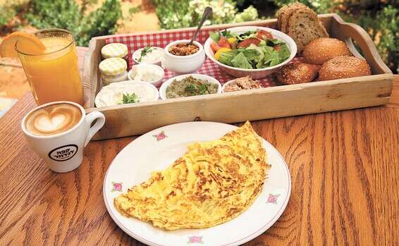 גמישות: תוספות לחביתה יעלו 5-3 ש' (פטריות יעלו 3 ש', גבינת פטה 5 ש'). המרת המיץ לשתייה קלה, הגדלת הקפה והחלפה לחלב סויה ללא תוספת תשלום.