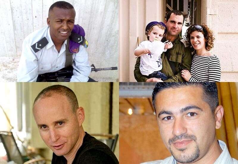 עם כיוון השעון: סא"ל דולב קידר ז"ל עם האלמנה מיכל והבת מאיה; רנ"ג רמי כחלון ז"ל; סא"ל אמוץ גרינברג ז"ל; רס"ב קסהון (דני) ביינסאין ז"ל