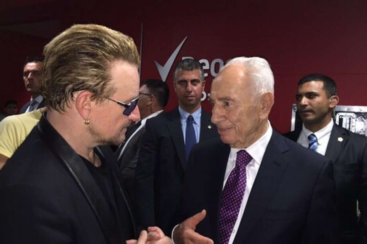 לאחר מכן נפגשו השניים בין הקלעים, שם אמר בונו לפרס: "העבודה שלנו קלה, אנחנו שרים על שלום ואתה מממש אותו". אחר כך פנה אליו בחיוך של רוקסטאר ואמר: "בשבילי לארח אותך פה זה רוקנרול, זה זיקוקים אמיתיים". פרס הודה לבונו על המחווה וההופעה ואמר: "היה לי ערב מיוחד במינו, אתה קול של תקווה ושלום אני מברך אותך. ראיתי איך הקהל מלא השראה ממך ואני שמח כי המסר שלך עובר בעולם".