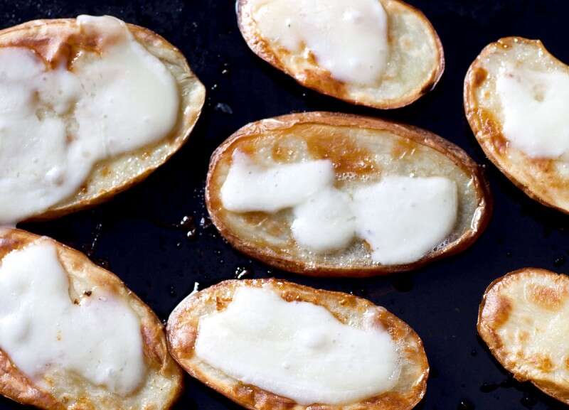 מחממים את התנור לחום של 180 מעלות. פורסים נייר אפייה על תבנית ומסדרים את פרוסות תפוחי האדמה זו לצד זו. מערבבים את השמנת המתוקה עם הפלפל והמלח ויוצקים מעל הפרוסות. אופים כרבע שעה. מוציאים, ובמרכז כל פרוסה שמים מעט מרוטב הצ'ילי ומעל פרוסת גבינה. מכניסים לתנור ומוסיפים לאפות כ־5 דקות או עד שהגבינה נמסה. מגישים מייד.