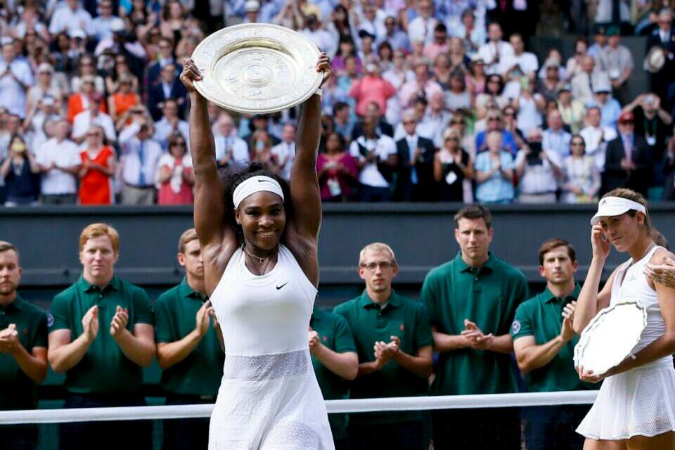 סרינה סלאם. סרינה וויליאמס זכתה היום בטורניר הגרנד סלאם ה-21 בקריירה והרביעי ברציפות באותה העונה – אליפות אוסטרליה הפתוחה, אליפות ארה"ב הפתוחה, והרולאן גארוס. האחות הצעירה לבית וויליאמס רשמה היום זכיה שישית בטורניר ווימבלדון היוקרתי כשגברה 4:6, 4:6 על גרבינייה מוגורוסה הספרדייה.