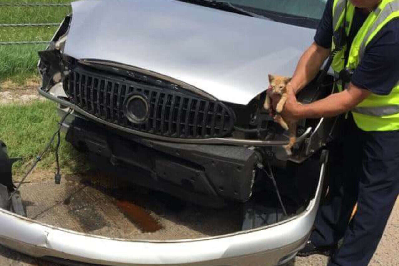 בזמן שהגיעו צוותי הרפואה והחילוץ לזירת התאונה, החלו לטפל בנהגת כשלפתע שמעו יללות מכיוון המנוע. כשהרימו את מכסה המנוע גילו את החתלתול הקטנטן מפוחד ומבוהל – אך בלי שריטה.