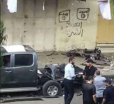 זירת אחד הפיצוצים. על הקיר ניתן לראות גרפיטי של מה שנראה כסמל של דאעש // צילום מסך מטוויטר
