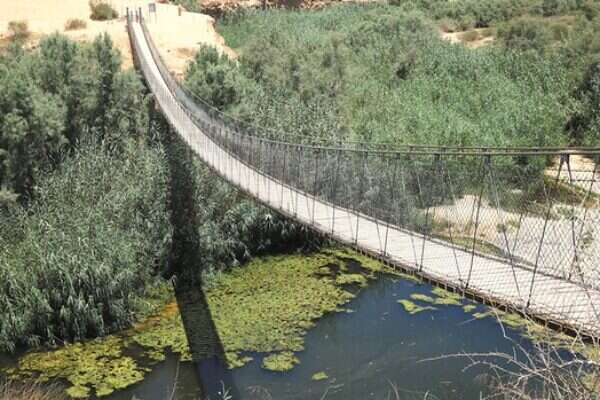 אחרי נסיעה קצרה לאורך הדרך (בקטע זה רובה כביש סלול) תגיעו לאחת האטרקציות האהובות על ילדים ומבוגרים כאחד - גשר החבלים. מדובר בגשר תלוי שאורכו כ־80 מטר והוא עובר מעל גב גדול באפיק הנחל - "גב המצוק". תוכלו לראות מהגשר צמחים, ציפורים ועופות מים, שסביר להניח שתבחינו בהם לעת שקיעה, אז החום כאן קצת נרגע. אני הצלחתי להבחין במשפחת צבי נחל, ששחתה במי הנחל.