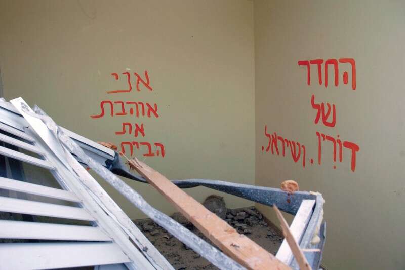 מישהו סתם את צעקתם בפסתר כתום עבה, תאי מעצר ודמוניזציה. הריסות בית ביישוב גני טל, 2005 // צילום:דודו גרינשפן