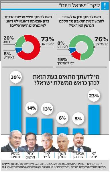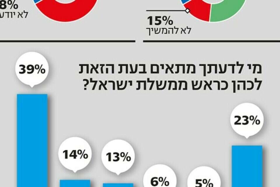 בהמשך נשאל הציבור מי לדעתו מתאים בעת הזו לעמוד בראש ממשלת ישראל - וגם כאן התשובה היתה חד־משמעית: 39% סבורים כי בנימין נתניהו הוא האיש המתאים. יצחק (בוז'י) הרצוג ויאיר לפיד נמצאים צמודים במקום השני והשלישי - 14% ו־13% בהתאמה, אחריהם משה כחלון עם 6%, ואביגדור ליברמן עם 5%. אם עושים את החשבון, התמיכה בנתניהו עולה על התמיכה בכל שאר המועמדים גם יחד.