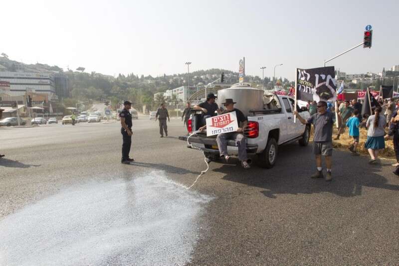 חלב על הכביש. החקלאים בהפגנה הבוקר בצומת הכניסה ליקנעם // צילום: מישל דוט קום