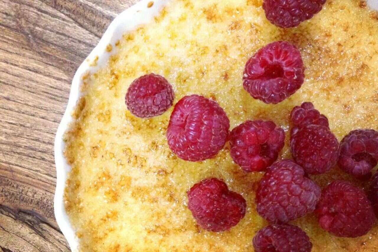 8. מיד לפני ההגשה מפזרים על הקרם שלנו כ-1.5 כפות של סוכר דמררה - מכסים בשכבה אחידה ודקה את כל הקרם בסוכר. באמצעות ברנר מקרמלים במהירות ובעדינות את שכבת הסוכר, מבלי לחמם את הקרם עצמו. אם אין ברנר בבית, ניתן להקפיא את הקרם, להכניס תנור על מצב גריל ולקרמל את הסוכר. אם בחרתם באופן זה, יש להיזהר לא להשאיר את הקרם לזמן רב מדי כדי שלא יתחמם.