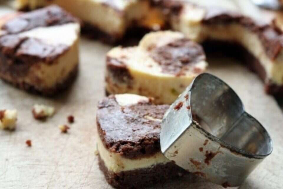 - משמנים תבנית אפייה ויוצקים לתוכה שני שלישים מתערובת השוקולד. יוצקים מעל את תערובת הגבינה ומקשטים מעל בשארית תערובת השוקולד בדוגמת שיש.