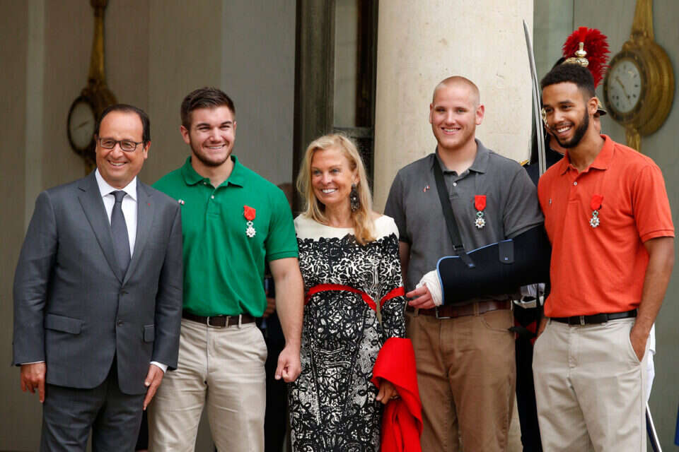 נשיא צרפת פרנסואה הולנד העניק אתמול עיטורים לשלושה אמריקנים ולבריטי אחד שמנעו פיגוע המוני ביום שבת ברכבת מאמסטרדם לפאריס, אחרי שניטרלו את המחבל החמוש שעלה לרכבת. אות "המסדר הלאומי של ליגיון הכבוד" נחשב לעיטור הגבוה ביותר של צרפת. נוסף עליהם הולנד הודיע כי יעניק את העיטור גם לאזרח צרפתי בן 28, שביקש לשמור על אנונימיות, ולאמריקני־צרפתי מארק מוגליאן (51) על חלקם בניטרול המחבל. הולנד אמר בין השאר: "סיכנתם את חייכם להגן על רעיון, רעיון של חירות וחופש. מאז יום שישי העולם כולו מעריץ את האומץ ורוח הסולידריות שלכם. זה מה שאיפשר לכם להשתלט על אדם חמוש".