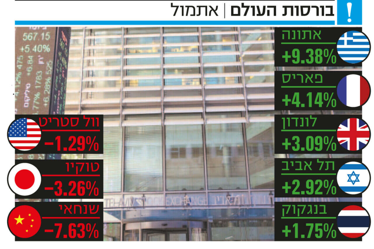 המגמה בתל אביב תאמה את האווירה בבורסות האירופיות. גם שם נרשמה התאוששות מתונה לאחר המפולות. עליות נרשמו בבורסות של לונדון, פאריס ופרנקפורט. יממה לאחר שהתרסקה ביותר מ־10%, עלתה אתמול הבורסה של אתונה בשיעור חד של 9.4%.