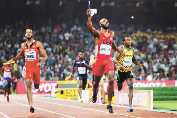 רביעיית השליחים האמריקנית ב־4X400 מ' היא ההפך הגמור מזו של ה־4X100 מ'. סיומת נהדרת של סגן אלוף העולם לאשון מריט סידרה לארה"ב זהב שישי ברציפות באליפות העולם. טרינידד וטובגו הפתיעה בשיא לאומי ובמדליית כסף, בעוד בריטניה זכתה בארד. רביעיית הנשים, לעומת זאת, שוב לא הצליחה לחצות ראשונה את קו הסיום.