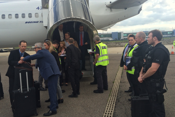 עם נחיתת מטוס אל על, ביקש הקברניט מכל הנוסעים לרדת מהדלת האחורית ורק נתניהו ורעייתו הורשו לרדת בדלת הקדמית. בגרם המדרגות האחורי המתינו לכל הנוסעים שהגיעו עם ראש הממשלה - מאבטחים, עיתונאים ואנשי צוות - שוטרים בריטים שדרשו מכל נוסע ונוסע להציג דרכון. רק לאחר שנבדקו כל הנוסעים ברשימות ניתן המעבר לרכבי השיירה.