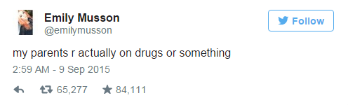 בעוד נערים רבים היו מגיבים באימה למראה תמונות כאלו שהוריהם היו מעלים לרשת, מוסון הצעירה דווקא קיבלה את הדברים ברוח טובה והעלתה אאת הצילומים של הוריה לטוויטר תחת הכותרת "ההורים שלי על סמים או משהו". לא שהייתה לה הרבה בריה אחרי הפוסט הוויראלי של הוריה שזכה לזכה ל-46 אלף שיתופים.
