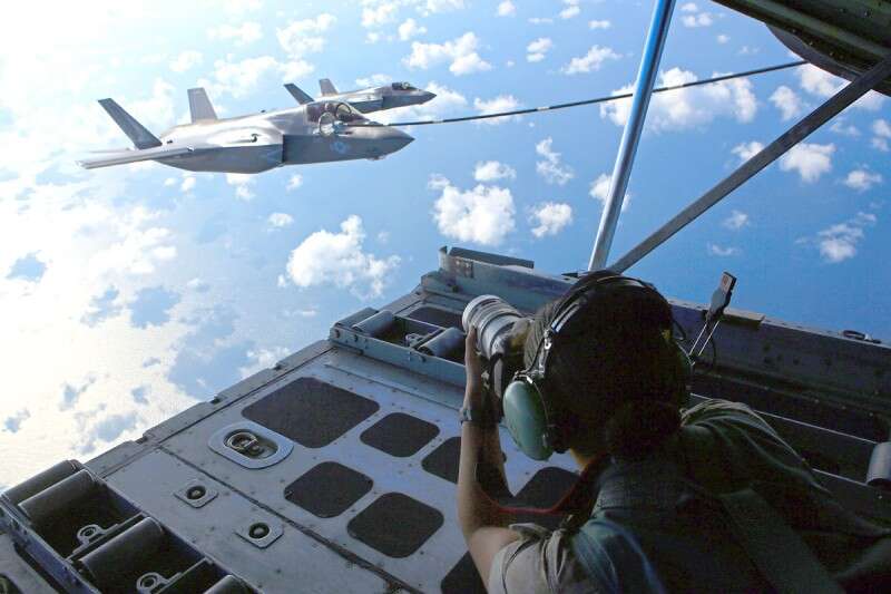 הרעש האדיר ברקע רק מוסיף להתרגשות ולהנאה מהנוף הקסום שנגלה לעינינו: שמיים כחולים, שאותם ממלאת תפזורת עננים לבנים־ורודים. מתחתינו ים כחול צלול במיוחד, ומפעם לפעם אפשר לראות גם ספינות. איש הצוות נוגע בכתפי ומצביע לכיוון שעה 5:00 של המטוס שבו אני נמצא. "הנה הם באים", הוא אומר, ומהר מאוד הם מופיעים. שני F-35, מטוסי הקרב המתקדמים ביותר בעולם, מבהיקים כאילו ירדו זה עתה מפס הייצור (מה שלא רחוק מהאמת).