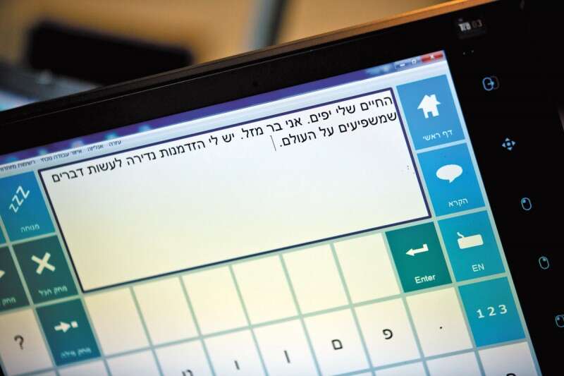 "טכנולוגיה די ישנה", הוא אומר, "אבל היא כל הזמן משתפרת. יש גם עכבר ראש, אבל זה למי שיכול להזיז את הראש. אני לא יכול. רק את הגבות וטיפה את הפה", הוא כותב ומדגים את החיוך שעוד אצור אצלו בזווית השפתיים. זה שבמהלך השיחה בינינו יגדל, כשאחד הבנים ייכנס לחדר ויבוא לנשק את הראש היפה של אבא, או כשההומור שלו יחזור וידגדג את המילים.