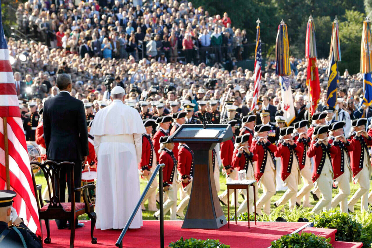 במחווה יוצאת דופן, את פניו קיבלו בנמל התעופה הצבאי אנדרוס, הסמוך לוושינגטון, נשיא ארה"ב ברק אובאמה, לצד אשתו מישל ובנותיהם, וכן סגן הנשיא ביידן ומשפחתו. מטוס "אליטליה", שעימו הגיע האפיפיור דרך קובה, עוטר בדגלי ארה"ב והוותיקן, ובטקס הקצר שרה לכבודו מקהלת תלמידי בתי ספר קתוליים. בניגוד לשאר המכובדים שעזבו את המקום בלימוזינות, את הנסיעה לבית הלבן עשה הכס הקדוש במושב האחורי של רכב פיאט 500 קטן.