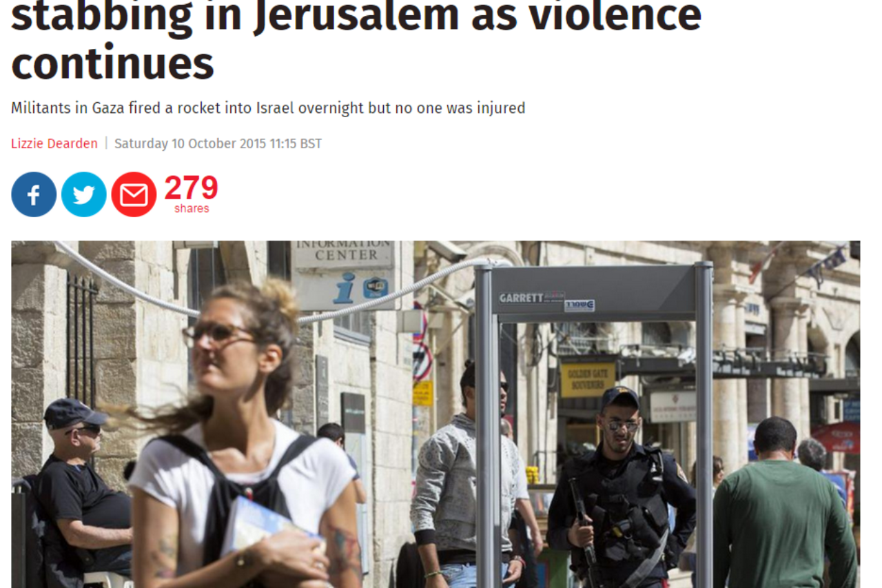 בהפניה מעמוד הפייסבוק של העיתון הבריטי נכתב כי המחבל הוא "הפלשתיני השביעי שנהרג ב־24 השעות האחרונות". הקישור עצמו היה לא פחות מגמתי; נכתב בו כי "פלשתיני בן 16 נורה הבוקר על ידי המשטרה". רק בפיסקה השנייה של הידיעה דווח על דבר הדקירה.