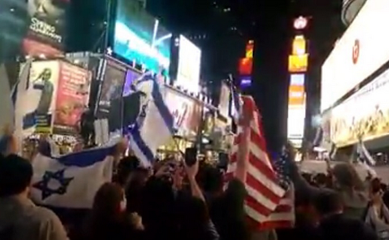 בטיימס סקוור בניו יורק והפך לויראלי, מחמם את הלב. המוני אמריקנים פרו ישראלים יוצאים לכיכר המפורסמת, מניפים דגלי ישראל וארצות הברית, מחזיקים בשלטים הקוראים להפסקת הטרור ולביטחון ישראל, ולבסוף שרים את "התקווה".