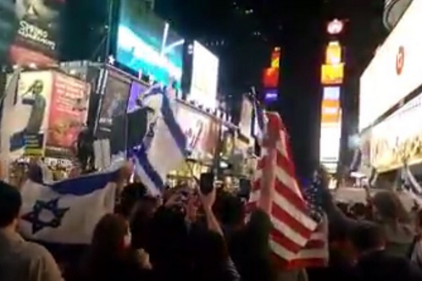 בטיימס סקוור בניו יורק והפך לויראלי, מחמם את הלב. המוני אמריקנים פרו ישראלים יוצאים לכיכר המפורסמת, מניפים דגלי ישראל וארצות הברית, מחזיקים בשלטים הקוראים להפסקת הטרור ולביטחון ישראל, ולבסוף שרים את "התקווה".
