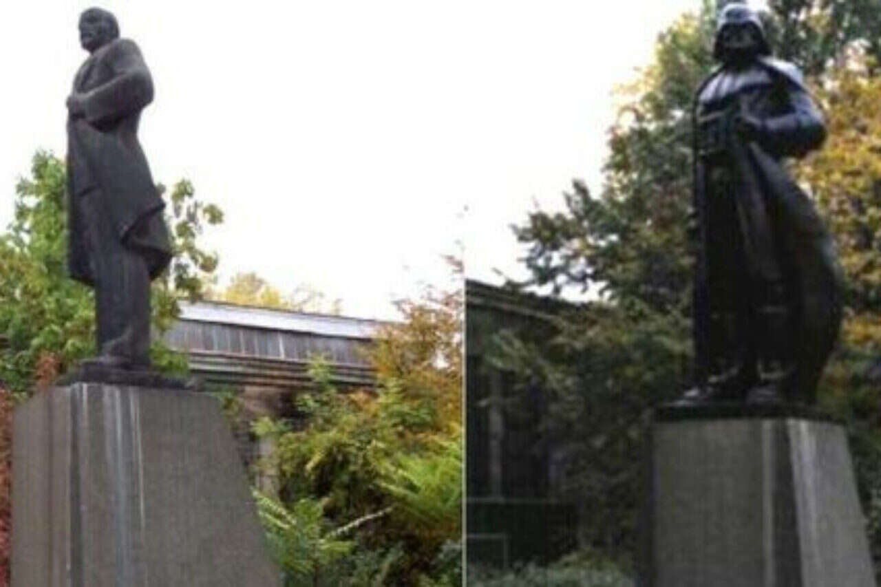 "הכוח מתעורר" באוקראינה: פסל ברונזה של ולדימיר לנין עבר שינוי על ידי אמן חובב מדע בדיוני והוסב לפסלו של "דארת' ויידר" - אחד מהרשעים הפופולריים ביותר מעולם סרטי הקולנוע שדמותו מופיעה בסדרת סרטי "מלחמת הכוכבים.
