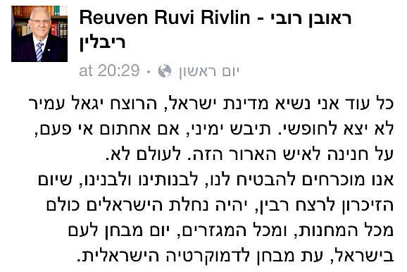 עמיר (47) פירסם אתמול בבוקר פוסט בעמוד הפייסבוק שלו שממנו עולה חשד לאיומים נגד הנשיא. הרקע לכתיבת הפוסט היא הודעת הנשיא מהימים האחרונים כי לא יחון את יגאל עמיר. "כל עוד אני נשיא מדינת ישראל, לא ייצא הרוצח לחופשי. תיבש ימיני אם אחתום אי פעם על חנינה לאיש הארור הזה. לעולם לא", כך אמר ריבלין במסגרת השבוע לציון עשרים שנה להירצחו של יצחק רבין.