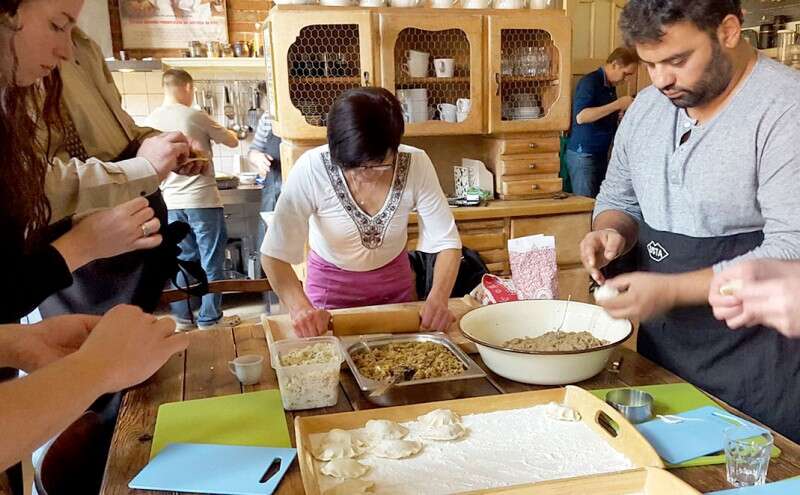 המטבח מתארגן לשיעור בהכנת פירוגי. אלופת המחוז בהכנת הכיסונים, אישה צנומה וחייכנית, היא המורה, מכינה מילוי פטריות אופייני לאזור, מילוי מכרוב ומגבינה ועוד אחד של בשר. כולם מתובלים באיפוק, משאירים מקום לטעם הבצק שלה.