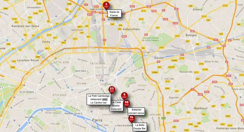 מפת הפיגועים בפאריס אמש // גוגל מפות