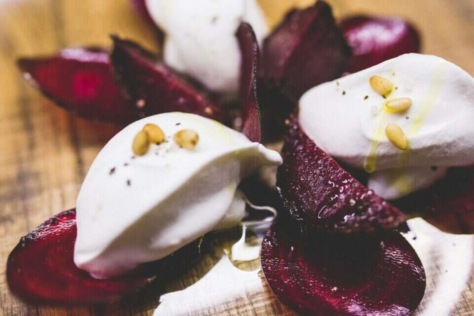 7. מרכיבים את המנה: על צלחת הגשה מורחים בתחתית מעט מהמחית סלק, מעליה מסדרים את הסלקים המבושלים והסלקים החיים שפרוסים דק. בוצעים חתיכות מהמוצרלה ומסדרים יפה בצלחת. מעל המוצרלה שמים כפית מהקצפת שתכסה אותה ומתבלים כל גבעה לבנה כזו במלח ופלפל שחור. מפזרים על המנה מעט מהתפוחים הכבושים ולבסוף מזלפים מהוינגרט צנוברים. מפזרים מעט צנוברים ומקשטים במעט נבטי סלק או עלים קטנים ויפים אחרים שיש לכם