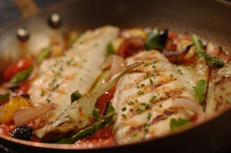 4. מבשלים יחד כ2-3 דקות ומסדרים את פילה הלברק במרכז המחבת , ממשיכים לבשל יחד כחצי דקה נוספת, מפזרים פטרוזילייה קצוצה ועשבים מעל ומגישים.