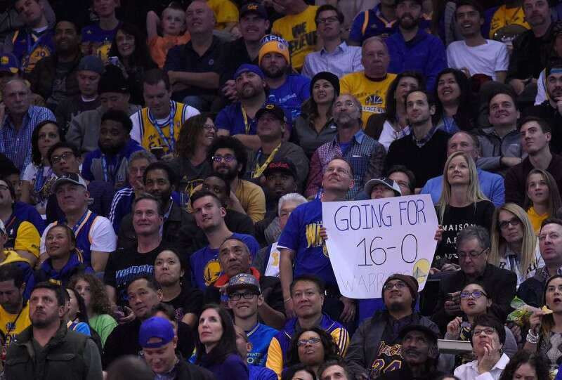 גולדן סטייט עלתה הלילה למאזן 0:16 ושברה את שיא פתיחת העונה הטובה ביותר שהייתה שייכת ליוסטון רוקטס (1993/4) ו-וושינגטון קפיטולס (1948/49). בקצב הזה, האוהדים שלהם ימשיכו להניף שלטים כאלה עוד הרבה זמן (צילום: אי.אף.פי)