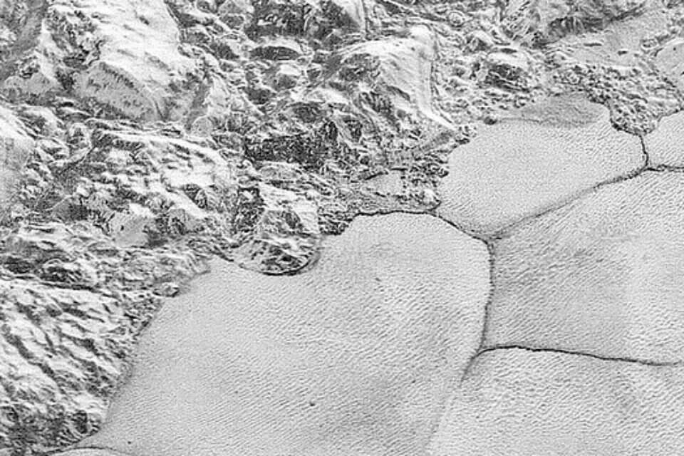 אלו התמונות הברורות ביותר שנשלחו עד היום של כוכב הלכת הננסי, נראים בהן מכתשים, הרים וקרחונים והן מכסות שטח ברוחב 80 ק"מ המשתרע עד האופק, מצפון־מערב למישור ספוטניק, מעבר להרי אל־אידריסי ועד למישורי הקרחונים.
