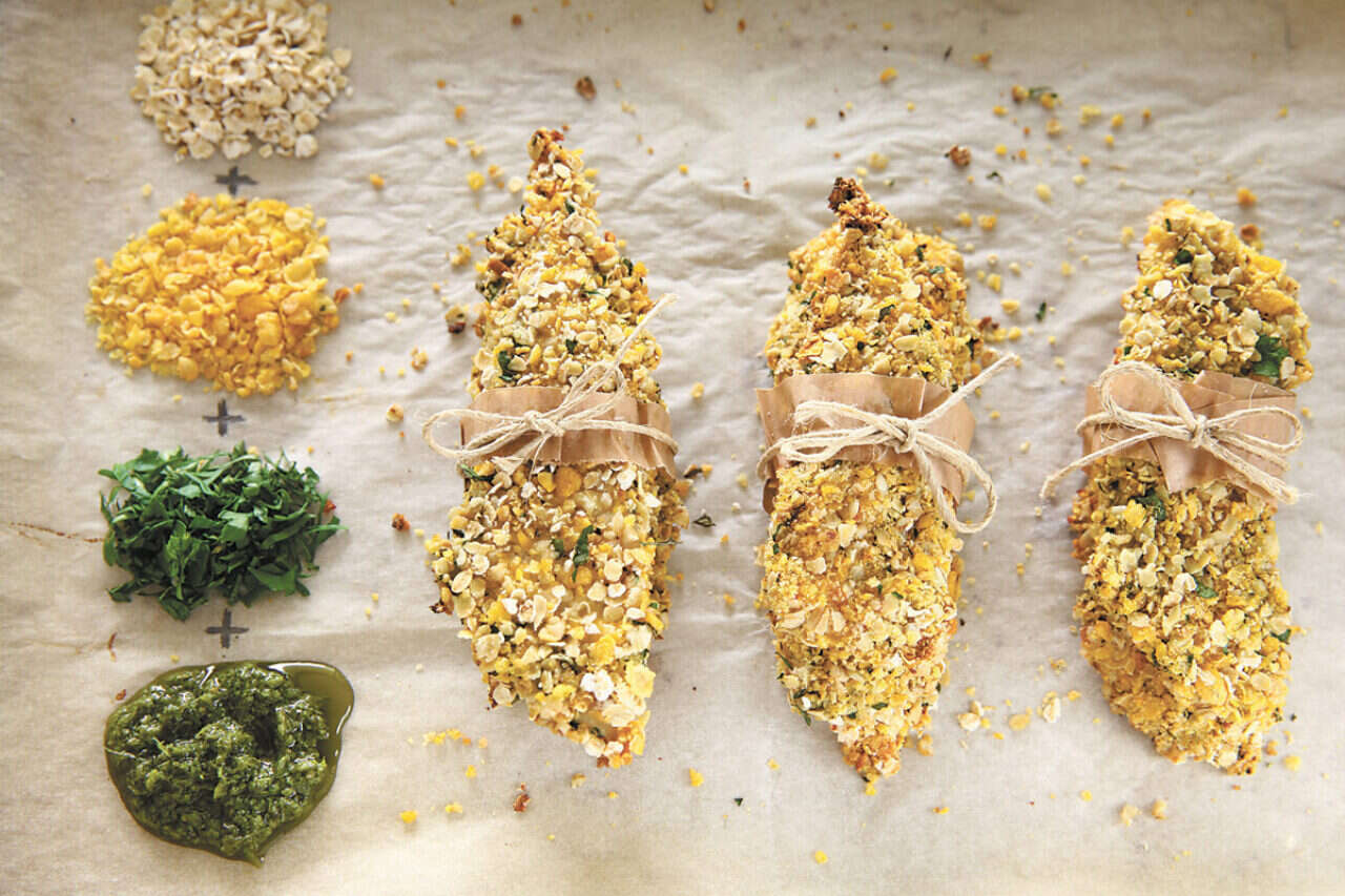 שניצלים אפויים מצופים בשיבולת שועל ובפסטו