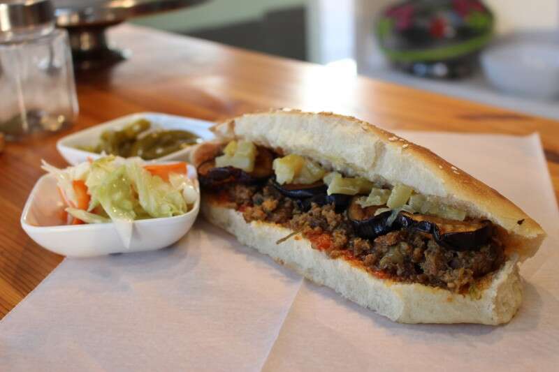 בתוך הסנדוויץ' הזה מככבים גם לימון כבוש שמסתכל עלינו מלמעלה מתוך הצנצנות על המדף, וחצילים מטוגנים פרוסים דק. כל זה מוגש לצד כרוב וגזר מוחמצים, עשויים - איך לא, במקום, ופלפלים ירוקים חריפים כבושים במלח, ולא מטוגנים כפי שכולם מצפים ממנה, כי זה מה שהכי מתאים בסנדוויץ', אומרת עליזה.