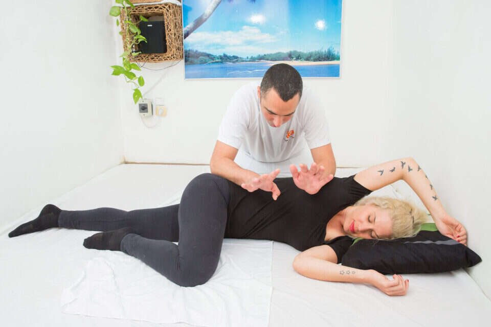 נועה מתחילה בעיסוי ובלחיצות להרגעה באזור הצוואר והכתפיים ומייד משתרר שקט בראשי ושריריי מתרפים. היא עוברת ללחוץ על כל מיני מקומות באזור הבטן, במטרה לשחרר חסימה שאותה איבחנה כמגיעה משם. בעזרת השיחה המקדימה והגדרת הטיפול ההתמקדות מביאה להקלה גדולה.
