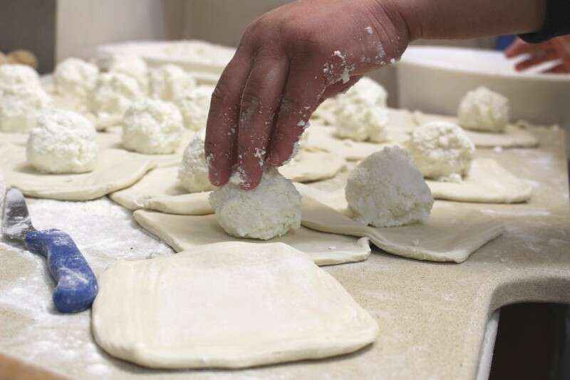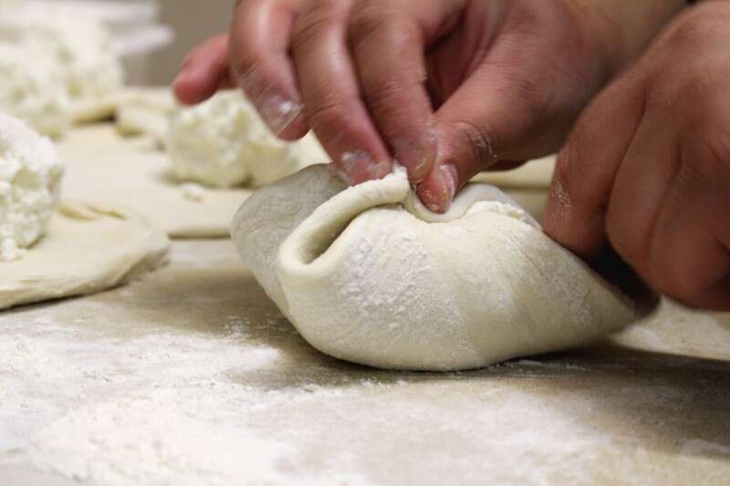 פעולת מילוי הגבינה בבצק החצ'פורי (צילום, רעות סהר)