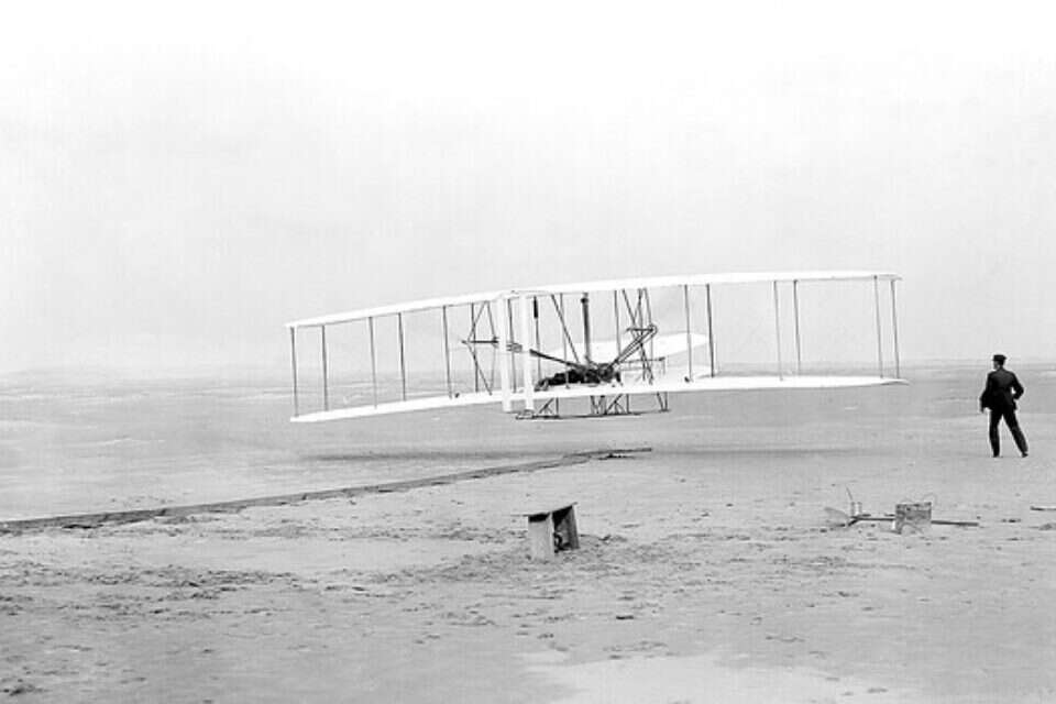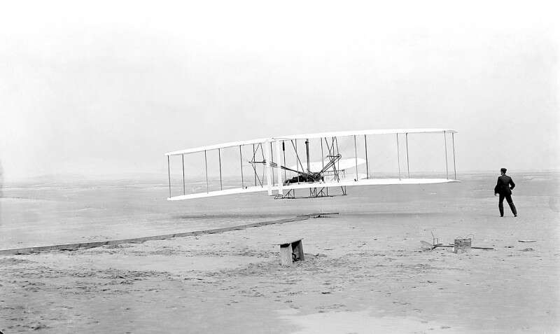ב־17 בדצמבר 1903 ביצעו האחים רייט את הטיסה הראשונה בכלי טיס כבד מן האוויר. הטיסה הראשונה באותו יום נמשכה 12 שניות, למרחק של 37 מטרים. האחים ווילבור ואורוויל רייט היו הראשונים לפתח מטוס בעל מנוע, יכולת בקרה ויכולת להטיס בן אדם בתוכו, ונחשבים למובילים בהבנת האמצעים הנוגעים להתפתחות התעופה