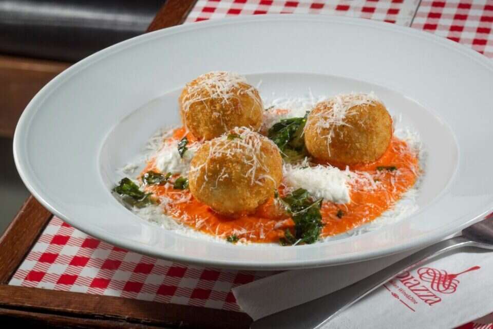 • פיאצה: "ארנצ'יני"- כדורי ריזוטו פריכים במילוי תירס ואווז, על קרם פלפלים ושמנת חמוצה.