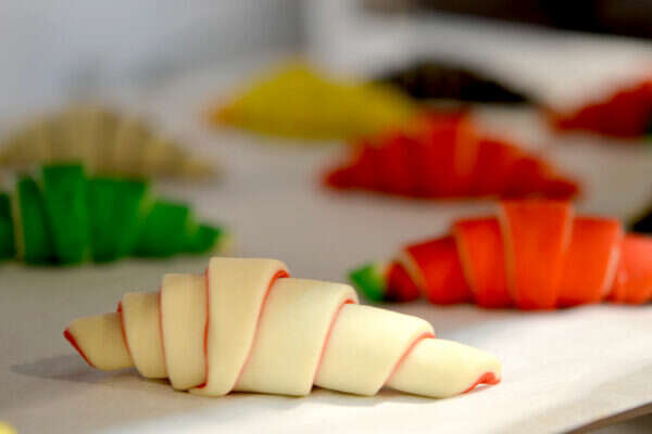 כדי לייצר את הגוונים למאפה, לוקחים 50 גרם מהבצק המוכן והמקופל ומעבדים במעבד מזון עם 5 טיפות צבע מאכל (אדום צהוב או ירוק). את הבצק הצבוע העבירו לקירור קל עד להתייצבות. אחר כך יש לרדד אותו לעלה במידות הבצק המקופל, להניח את העלה הצבוע מעל הבצק ולרדד יחד לעלה בעובי 3 מ"מ, ובמידות 60X30 ס"מ. מחלקים ל־12 משולשים שבסיסם 11 ס"מ. מתפיחים כשעתיים לפחות (תלוי בטמפ' החדר), מברישים בביצה ואופים ב־170 מעלות כ־17 דקות.
