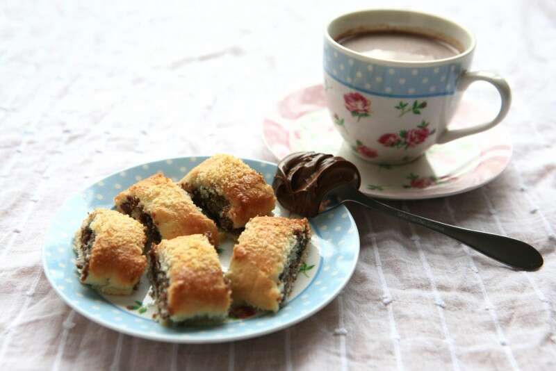3. מורחים חצי צנצנת ממרח שוקולד ומגלגלים לגליל ארוך.