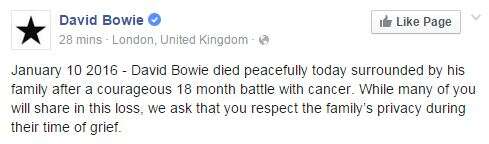 "דיוויד בואי מת בשלווה היום, כשהוא מוקף בבני משפחתו, לאחר מאבק אמיץ בן 18 חודשים בסרטן" נמסר בהודעה הרשמית, "בזמן שרבים מכם שותפים לאובדן, אנו מבקשים שתכבדו את פרטיות המשפחה בזמן האבל".