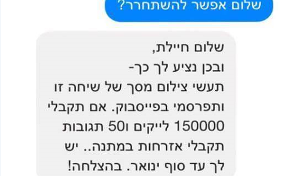 דוגמה נוספת מישראל - חיילת הטוענת כי צה"ל ישחרר אותה מהצבא אם פוסט הפייסבוק שלה יצבור 150,000 לייקים ו-50 תגובות, אבל כאן הסיכוי שמדובר במקרה אמיתי, איך נגיד, קצת פחות גבוה...