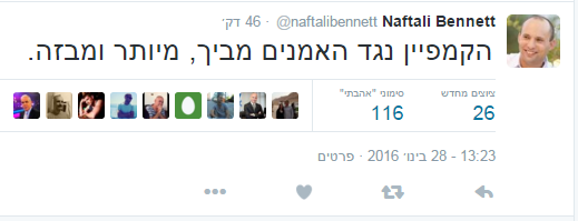 גם שר החינוך נפתלי בנט יצא היום (חמישי) נגד התנועה וצייץ בטוויטר כי "הקמפיין נגד האמנים מביך, מיותר ומבזה".