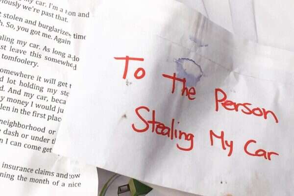 בפתק נכתב: "אם אתה קורא את זה, אתה ככל הנראה גונב את הרכב שלי. אני אדם נחמד ובוודאי הייתי נותנת לך טרמפ, אבל ברור שאני לא שם. הייתי רוצה לקבל רכב שקשה יותר לפרוץ אליו ולגנוב אותו, אבל אני מרוששת ונתקעתי עם הדבר הזה. אז, אם קלטת אותי, רק השאר את הרכב הזה והמשך בחייך. אף אחד לא יחקור את המקרה הזה לעומק".