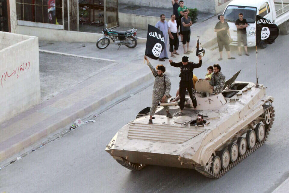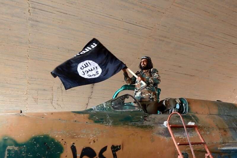 לוחם דאעש מניף את דגל הארגון במטוס שנתפס עם כיבוש בסיס חיל האוויר הסורי בטבקה // צילום: אי.פי.