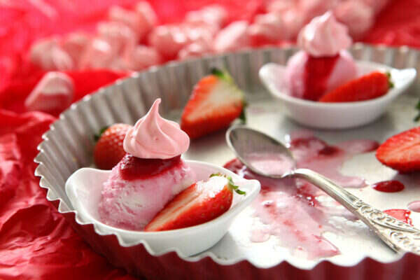 6. בהגשה: מקשטים כדורי גלידה קטנים של גלידה/ סורבה תות במרנגים קטנים ותותים טריים.