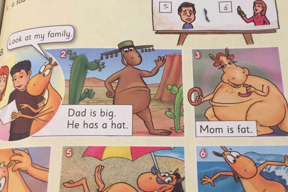 "אבא גדול ואמא שמנה", זה המשפט ששמע אתמול בבוקר אב לילדה בכיתה ג' שהתכוננה לשיעורי אנגלית, בזמן שבתו הקריאה תרגיל קריאה מתוך חוברת עם איורים של משפחה של קנגורואים, המאושרת על ידי משרד החינוך ללימודי האנגלית בכיתות ג'.