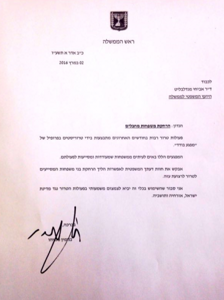 במכתב כתב ראש הממשלה: "אבקש את חוות דעתך המשפטית לאפשרות הליך הרחקת בני משפחות המסייעים לטרור לרצועת עזה".