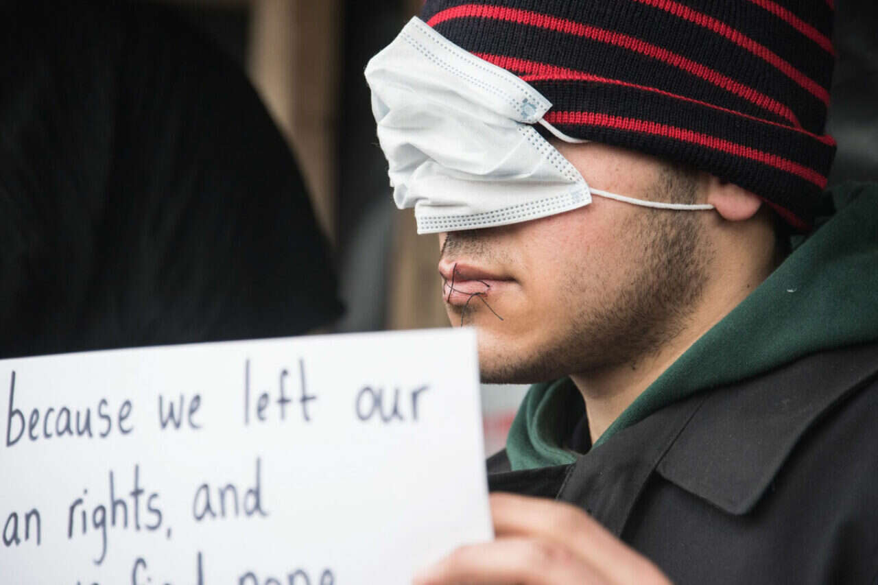 המוחים תפרו בעזרת מחט וחוט תפירה פשוטים את השפתיים שלהם, והחלו לצעוד ב"ג'ונגל", תוך שהם מניפים שלטים עליהם הם כתבו "אנחנו אנושיים", "היכן הדמוקרטיה שלכם? היכן החירות שלנו?". רופאים מארגון "רופאים ללא גבולות" המתנדבים במחנה הפליטים סיפרו כי האיראנים ביקשו מהם לתפור להם את השפתיים, "כמובן שסירבנו" סיפרו הרופאים, "הם עשו זאת בעצמם, בצורה מאוד לא סטרילית, תוך כדי שהם עיקרו את המחטים על ידי אש".